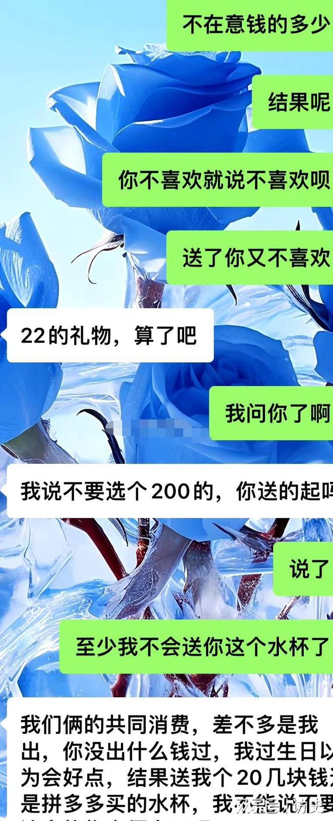 男生无语道:“我说不要选个200的,你送得起吗?我们俩的共同消费,差不多是我出,你没出什么钱过,我过生日因为会好点,结果送我个20几块钱还是pdd买的水杯,我总不能说不要,这个礼物太便宜了吧。”