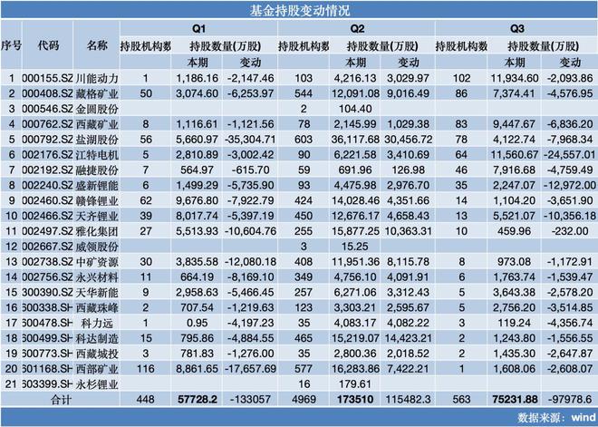 不过,观察君梳理发现,在Q2大举买入锂矿股的基金们,已经在Q3纷纷获利了结,持股机构数和持股数量均大幅减少。分析人士指出,锂价言拐点尚早,预计Q4及明年将持续在7-10万元/吨区间震荡。
